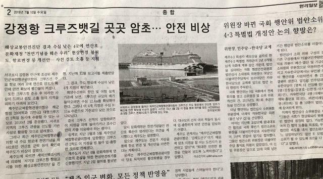 제주민군복합항 30도 항로(일명 크루즈 항로) 내에 암초가 다수 확인되어 크루즈항 운영에 빨간불이 켜졌다는 기사가 도내 모 일간지 7월 9일자 지면에 실렸다. 마치 이제야 그 사실이 확인된 듯 내용을 다루며, 그 암초가 천연기념물 442호 연산호군락 내여서 문화재청의 현상변경 불허로 준설이 불가능하기에 30도 항로 개설이 불가능하다는 내용이었다.