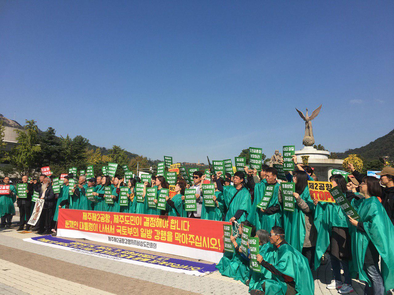 주민대책위를 포함, 제주도내 111개 시민사회단체로 구성된 ‘제주제2공항강행저지비상도민회의’는 오늘 환경단체와 종교계를 비롯한 전국의 시민사회단체들과 함께 촛불혁명으로 탄생한 문재인 정부의 청와대 앞에 섰습니다. 우리는 3년 전 박근혜 정권의 국정농단으로 드러난 온갖 적폐의 사슬을 끊어내기 위해 겨울 내내 차디찬 거리에서 촛불을 들었습니다. 그런데 우리의 기대와는 달리 문재인 정부에도 한국 사회를 주물러온 수구 기득권세력과 관료들이 자리 잡고 개혁에 완강히 저항하고 있습니다.
