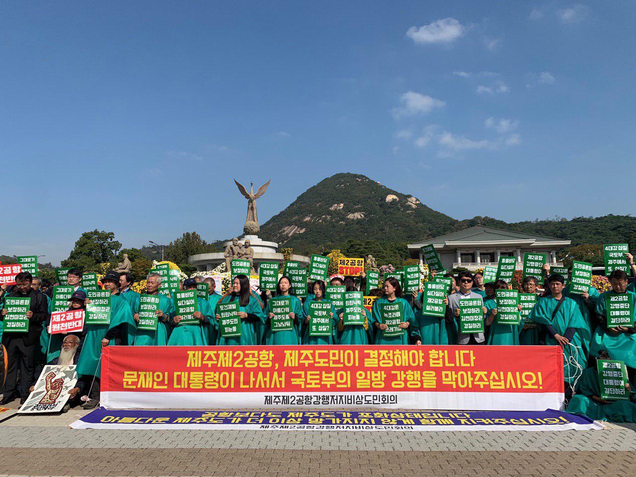 주민대책위를 포함, 제주도내 111개 시민사회단체로 구성된 ‘제주제2공항강행저지비상도민회의’는 오늘 환경단체와 종교계를 비롯한 전국의 시민사회단체들과 함께 촛불혁명으로 탄생한 문재인 정부의 청와대 앞에 섰습니다. 우리는 3년 전 박근혜 정권의 국정농단으로 드러난 온갖 적폐의 사슬을 끊어내기 위해 겨울 내내 차디찬 거리에서 촛불을 들었습니다. 그런데 우리의 기대와는 달리 문재인 정부에도 한국 사회를 주물러온 수구 기득권세력과 관료들이 자리 잡고 개혁에 완강히 저항하고 있습니다.
