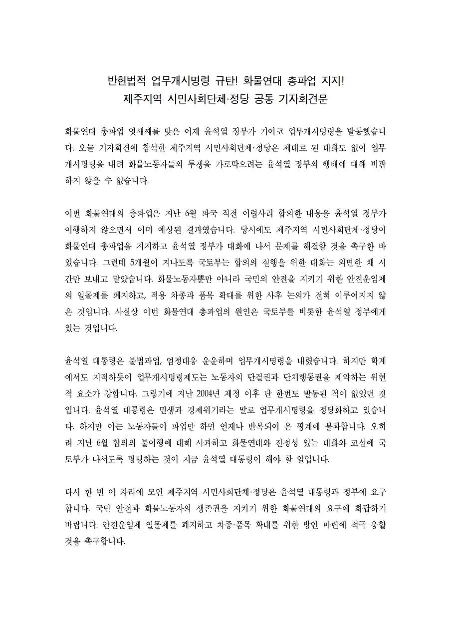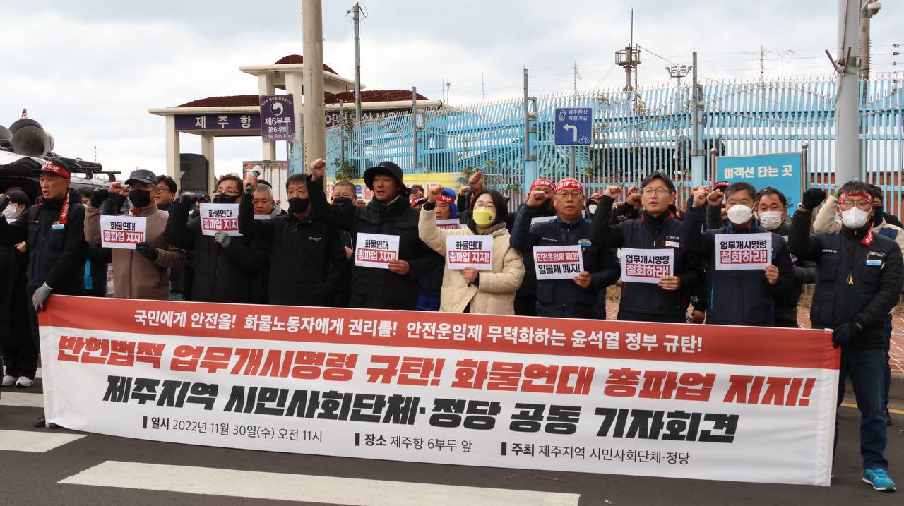 반헌법적 업무개시명령 규탄! 화물연대 총파업 지지! 제주지역 시민사회단체.정당 공동기자회견
