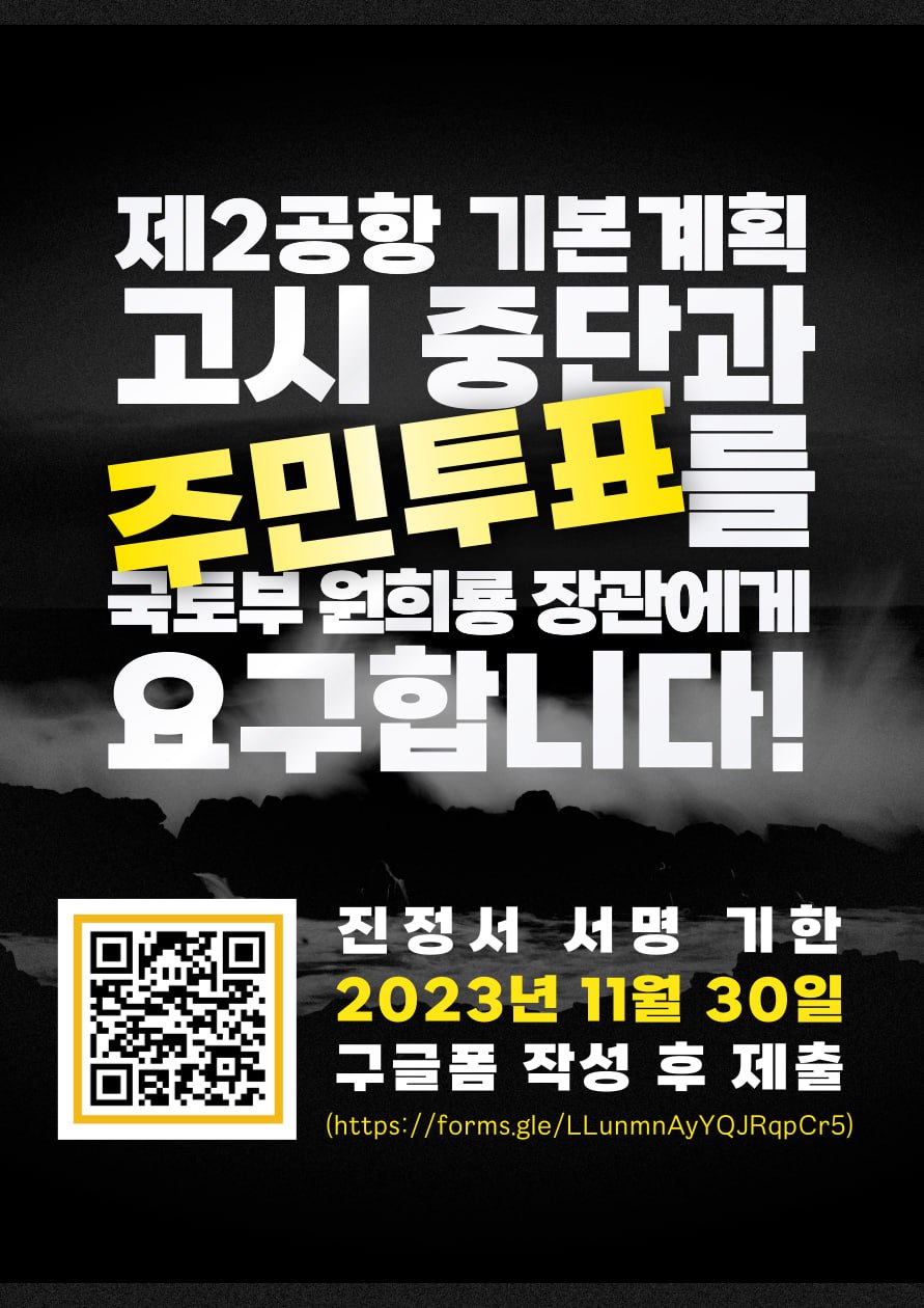 - 따라서 원희룡 국토교통부 장관은 기본계획 고시 절차를 중단하고, 제주도민 스스로 제2공항 추진 여부를 결정할 수 있도록 주민투표를 즉각 실시할 것을 강력히 요청합니다.