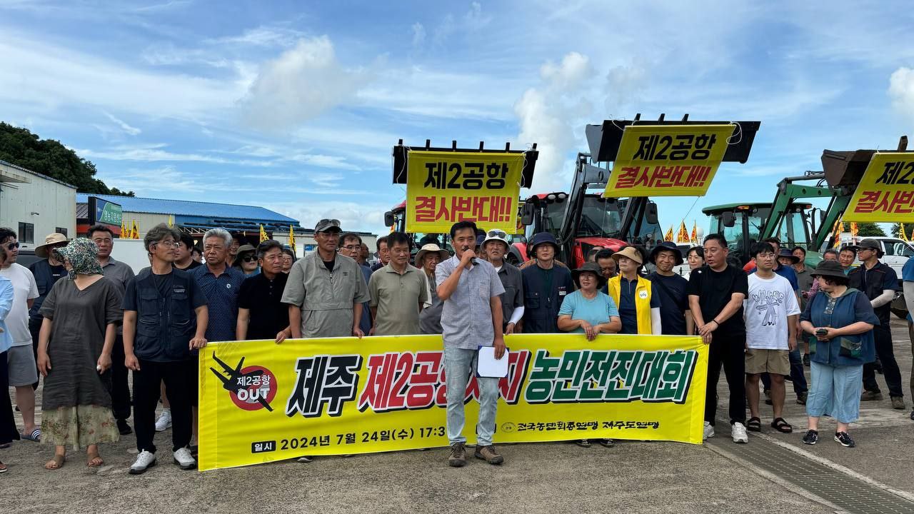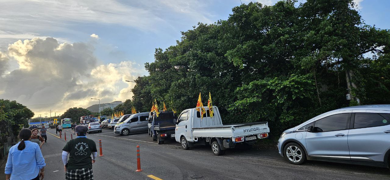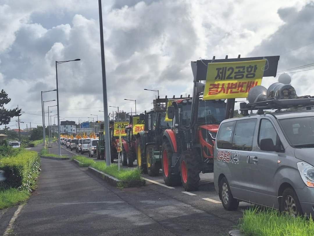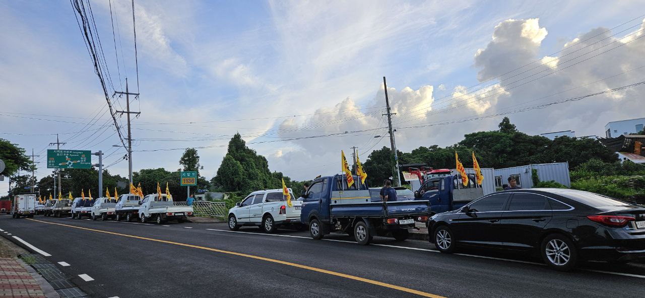 지난 7월 24일(수) 전국농민회 제주도연맹 소속 회원들과 지역 농민들, 제주지역 시민사회 활동가들이 차량과 농기구를 이용한 제2공항 저지 전진대회를 성산읍 관내에서 가졌습니다. 이날 50여대의 차량과 농기구를 이용한 행진은 제2공항 예정지 마을 신산리를 출발하여 온평리, 신양리, 성산리, 오조리, 시흥리, 고성리를 걸처 수산리에서 마무되었습니다. 차량행진의 모습은 제2공항 기본계획 고시를 앞둔 시점에 이뤄져 성산읍관내 지역주민들에게 새롭게 제2공항이 필요 없음을 알리는 계기가 되었습니다.