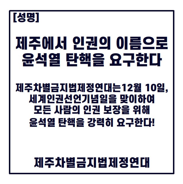 제주차별금지법제정연대는 12월 10일, 세계인권선언기념일을 맞이하여 모든 사람의 인권보장을 위해 윤석열 탄핵을 강력히 요구한다.