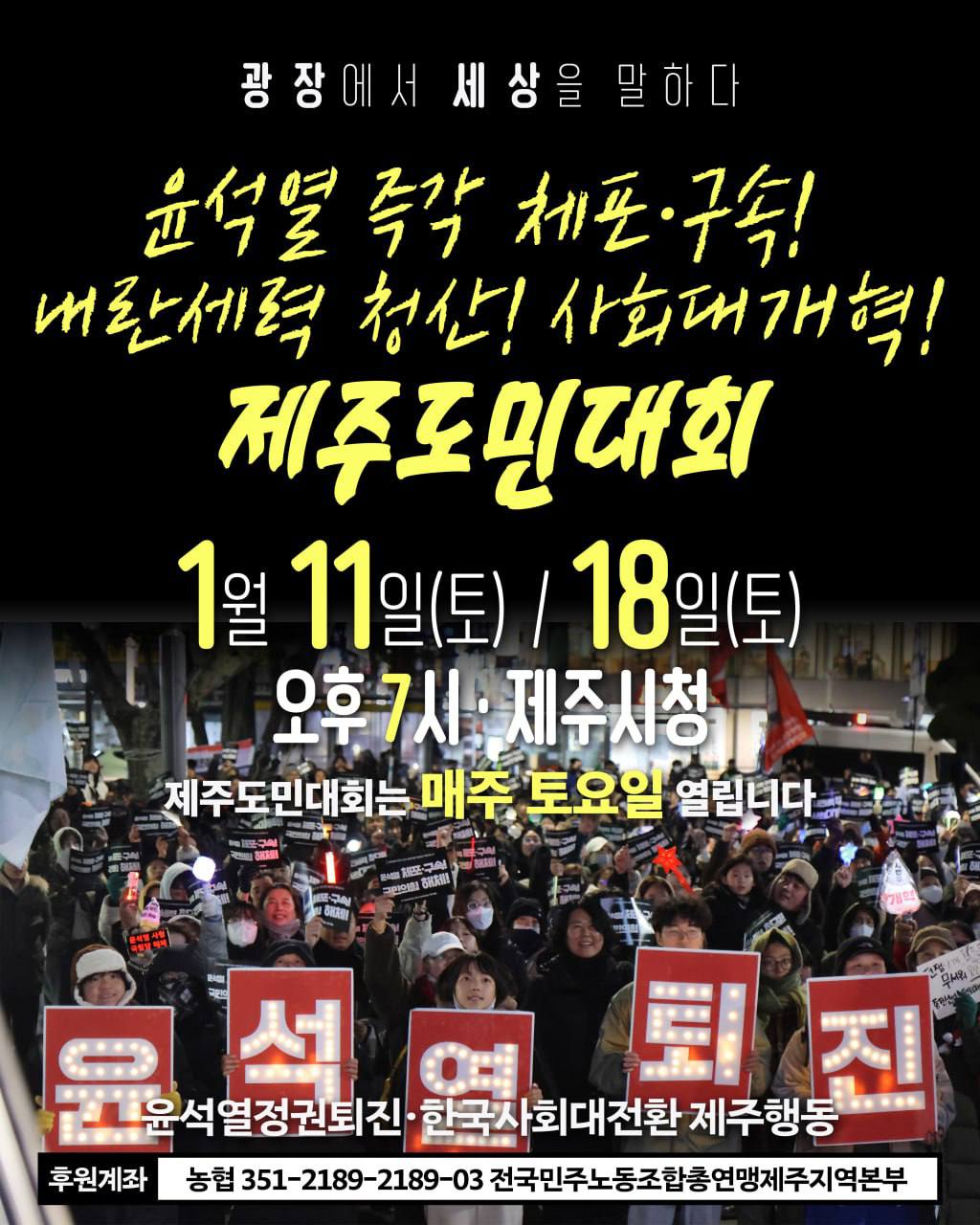 윤석열 체포구속 제주도민대회는 매주 토요일 진행됩니다. 많은 참여 바랍니다!