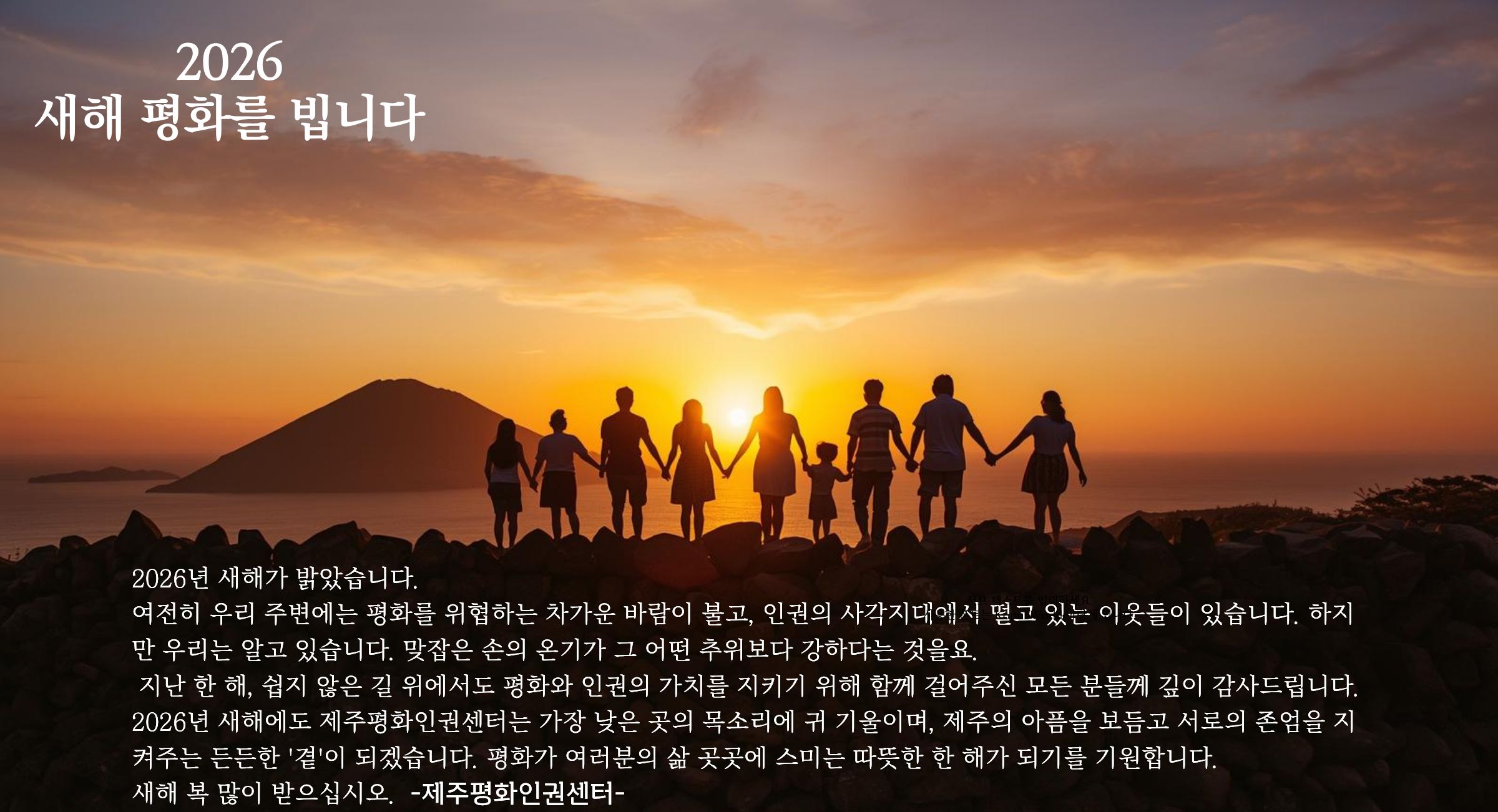 2026년 새해에도 제주평화인권센터는 가장 낮은 곳의 목소리에 귀 기울이며, 제주의 아픔을 보듬고 서로의 존엄을 지켜주는 든든한 '곁'이 되겠습니다. 평화가 여러분의 삶 곳곳에 스미는 따뜻한 한 해가 되기를 기원합니다.