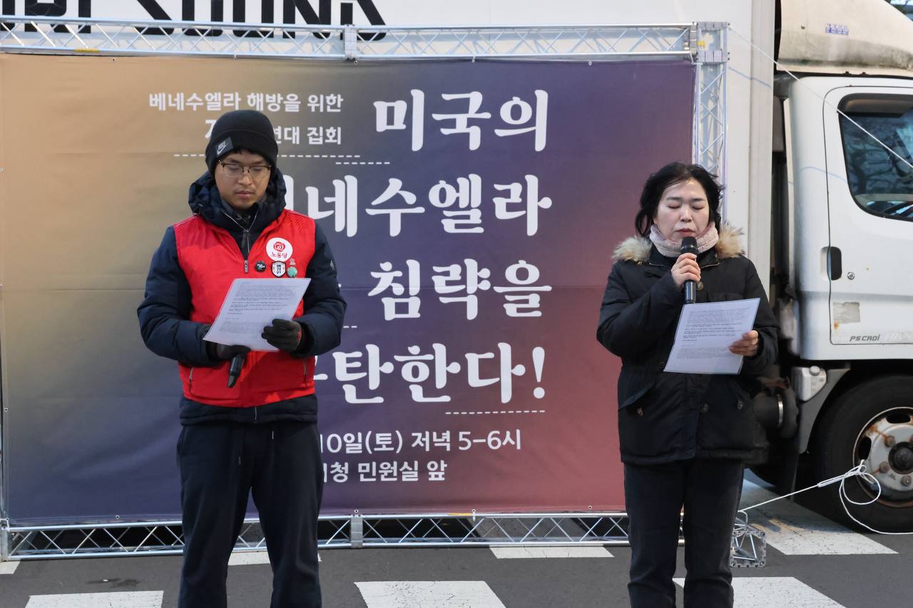 미 트럼프 정부는 작년 8월부터 베네수엘라의 민간 보트, 유조선 공격 및 완전 봉쇄를 단행한 바 있고 이 과정에서 150여명의 민간인을 학살한 바 있다. 미국의 베네수엘라 침략은 원유 세계 매장량 1위 베네수엘라의 석유 이권을 강탈하고 장악하기 위한 것, 제국주의에 반대하는 혁명 전통을 지닌 베네수엘라와 남미 대륙을 미국의 거대한 패권 전략 그림에서 자원 수탈 기지로 전락시키기 위한 것 이상으로 세계 민중에 대한 쿠데타 이자 전쟁 선언이다. 또한 세계 민중의 자주성과 평화, 민주주의에 대한 의지를 제압하려는 학살 선언이다.